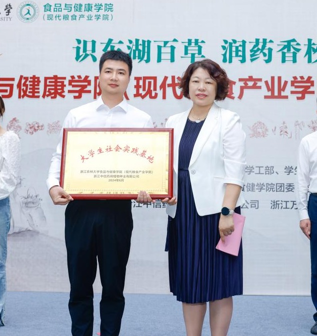 闵伟红为浙江中信药用植物种业有限公司授大学生社会实践基地铜牌,台上领导、嘉宾共同为学生代表赠送《黄帝内经》《神农本草经》等中药经典书籍。