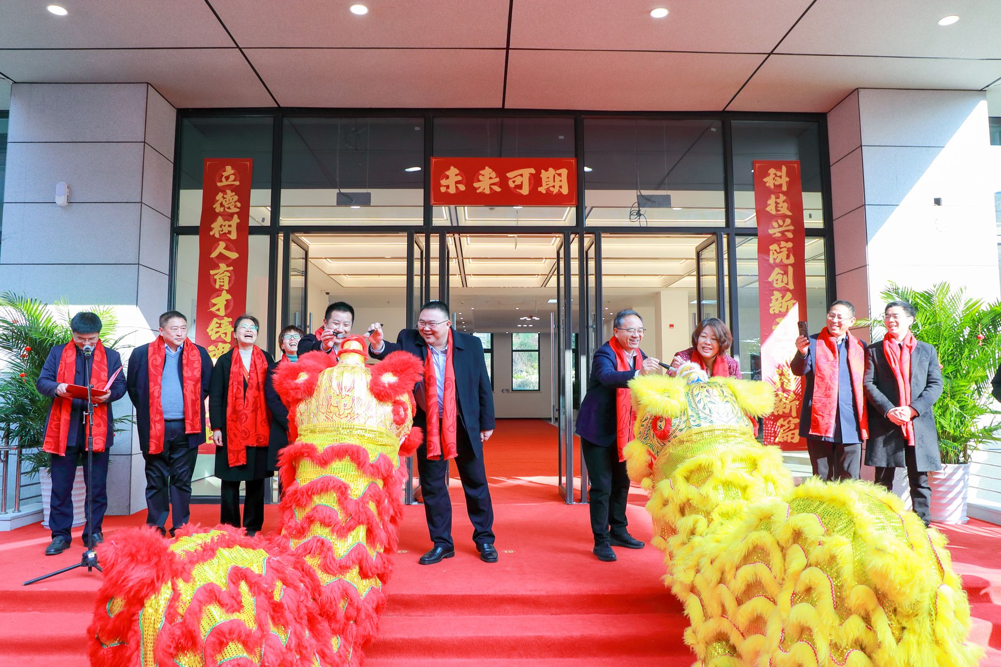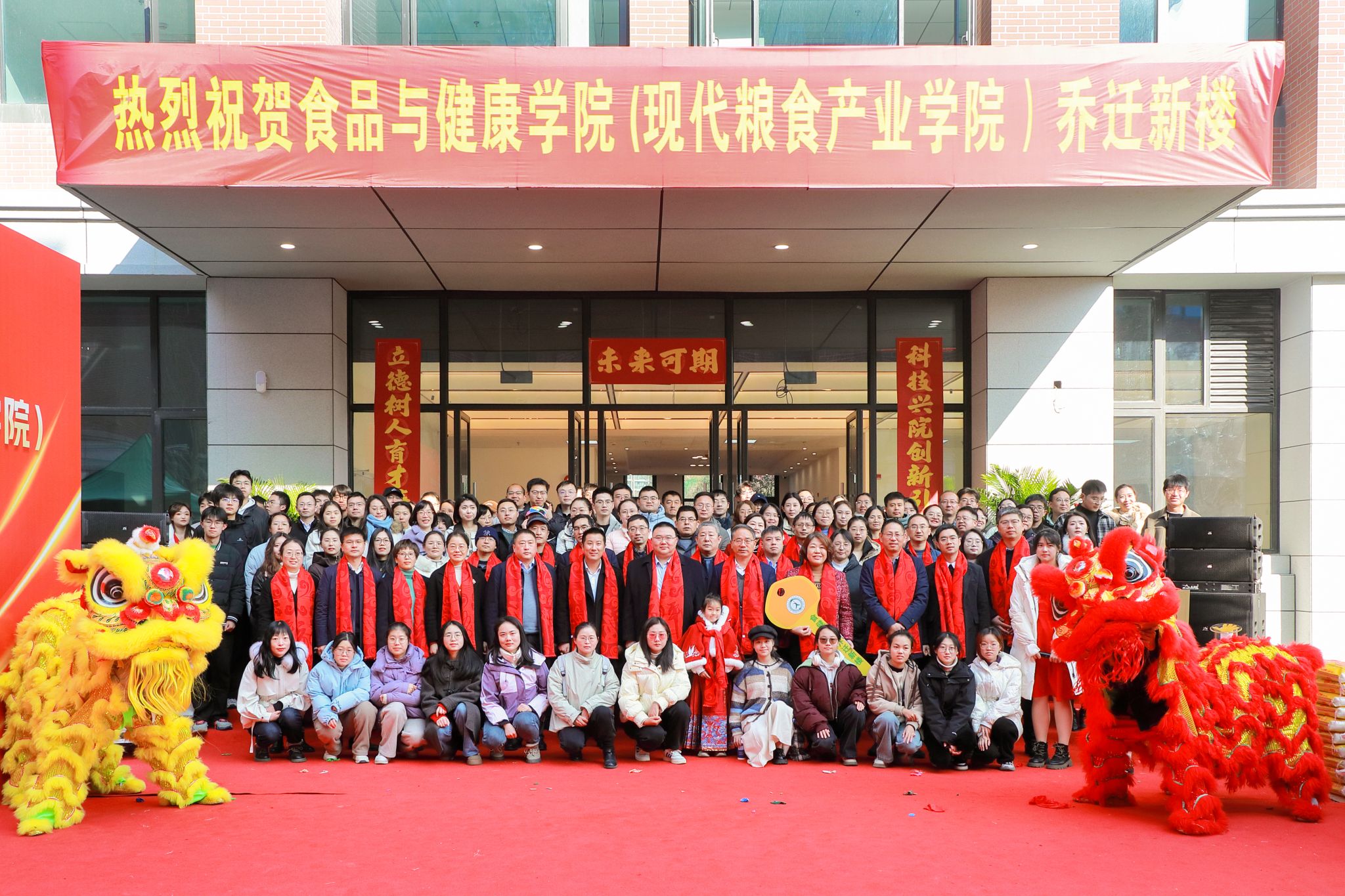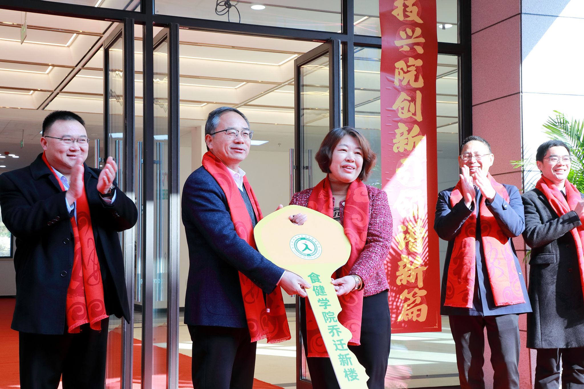 胡祖吉向学院移交新大楼钥匙,徐爱俊为新大楼揭牌,校领导与学院负责人共同为瑞狮点睛。学校体军部师生献上舞狮表演,传递吉祥纳福的美好祝愿。