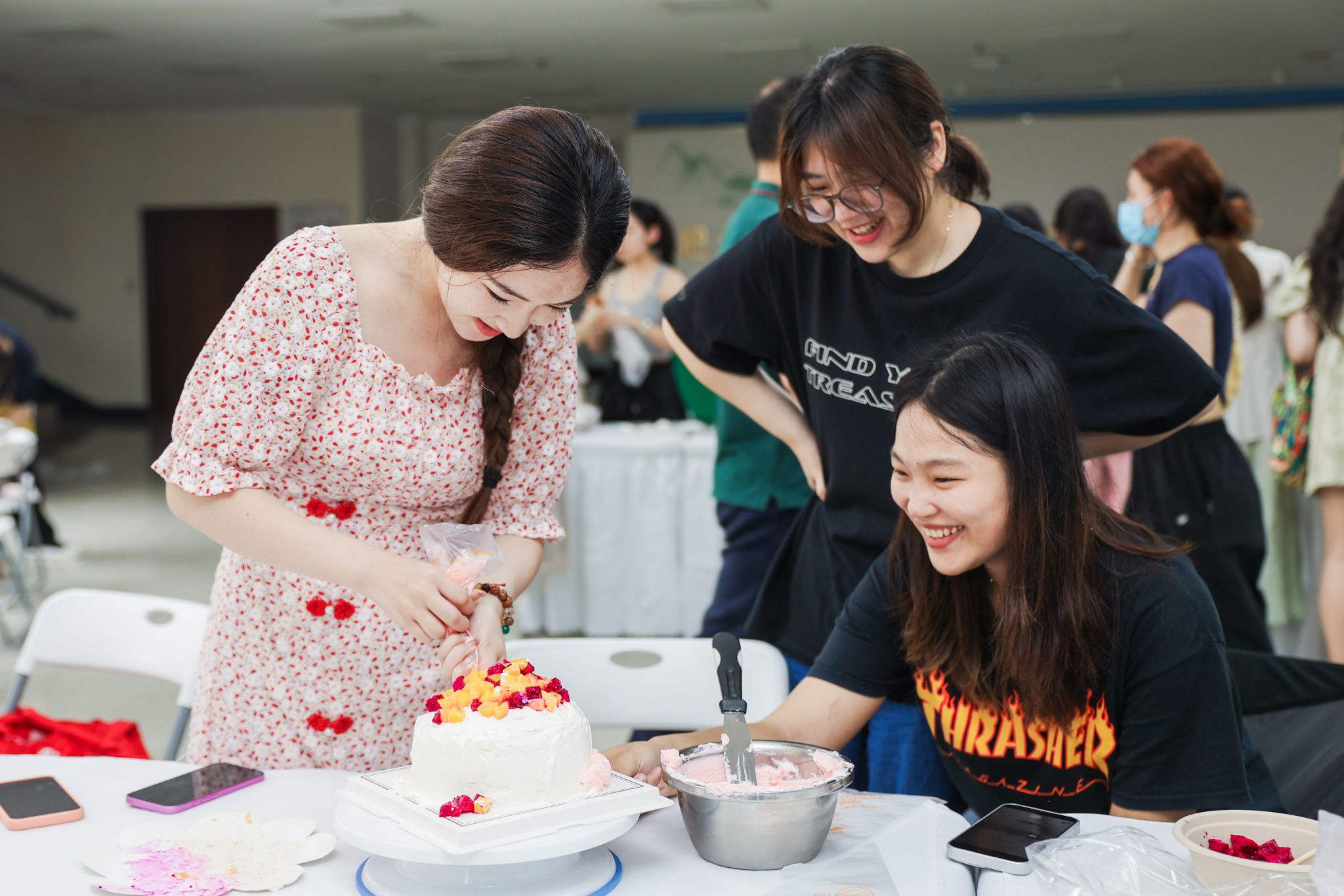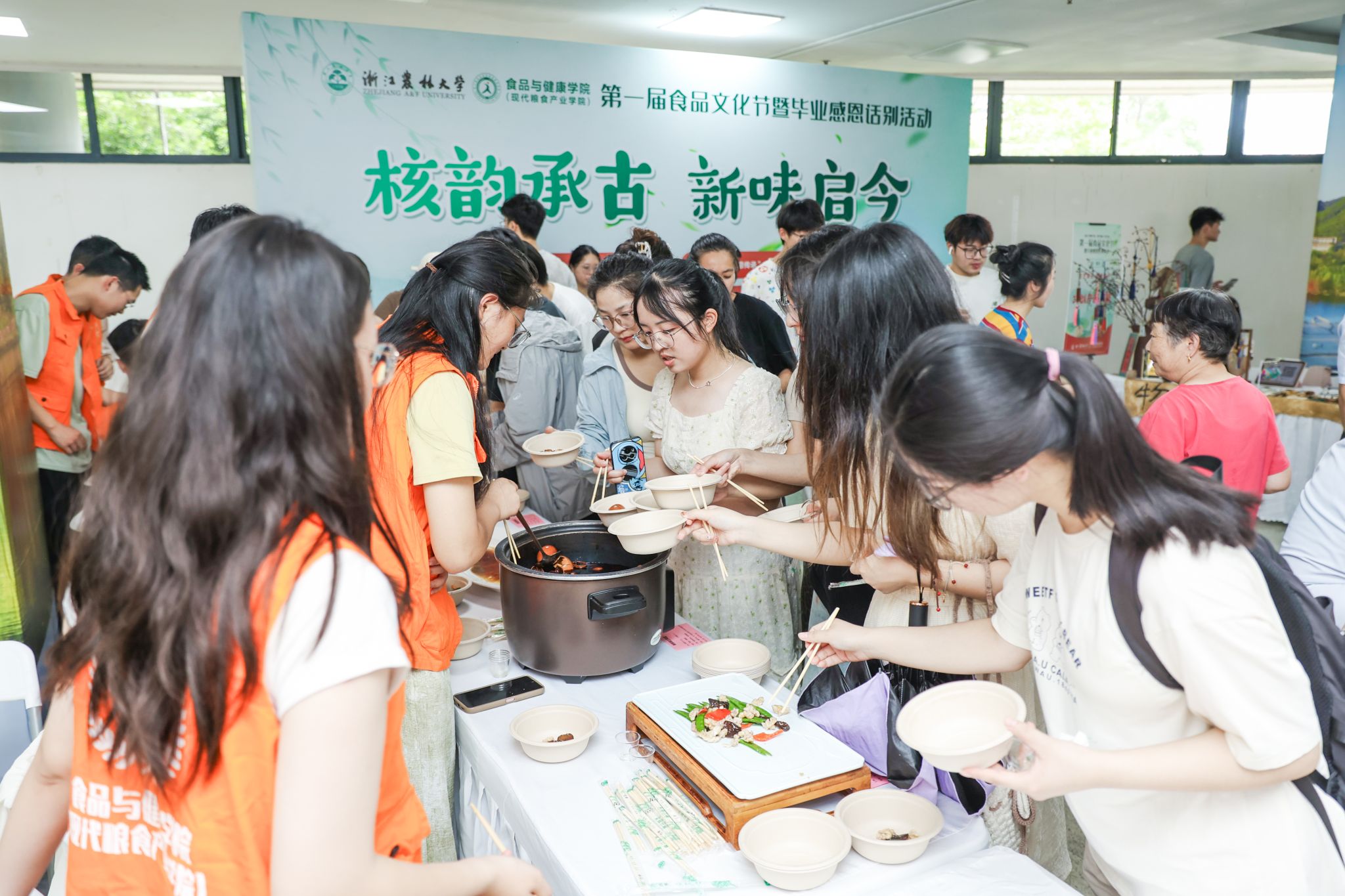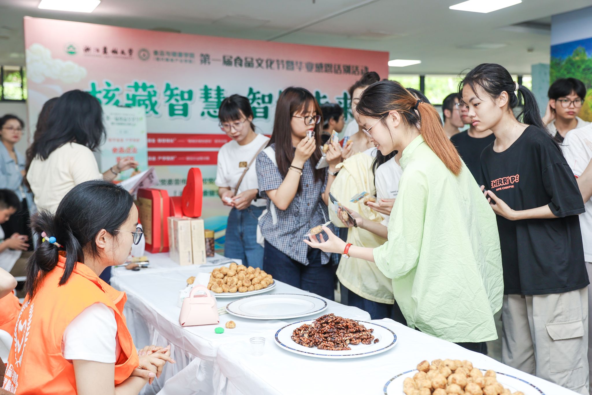 本次活动以“坚果之王”核桃为媒,以“核桃香韵,品味健康”为主题,设置了“核桃初识,文化启航”、“核韵承古,新味启今”、“核藏智慧,智链未来”、“核艺游园,邂逅美好”四大篇章。在活动现场,养生核桃暖锅、核桃煨土鸡蛋等创新菜式品鉴,得到现场师生一致好评,还有蛋糕裱花、核桃壳DIY体验、中试车间核桃主题作品等展位,让师生在品尝中感受快乐,在制作中收获开心,在参观中收获知识!