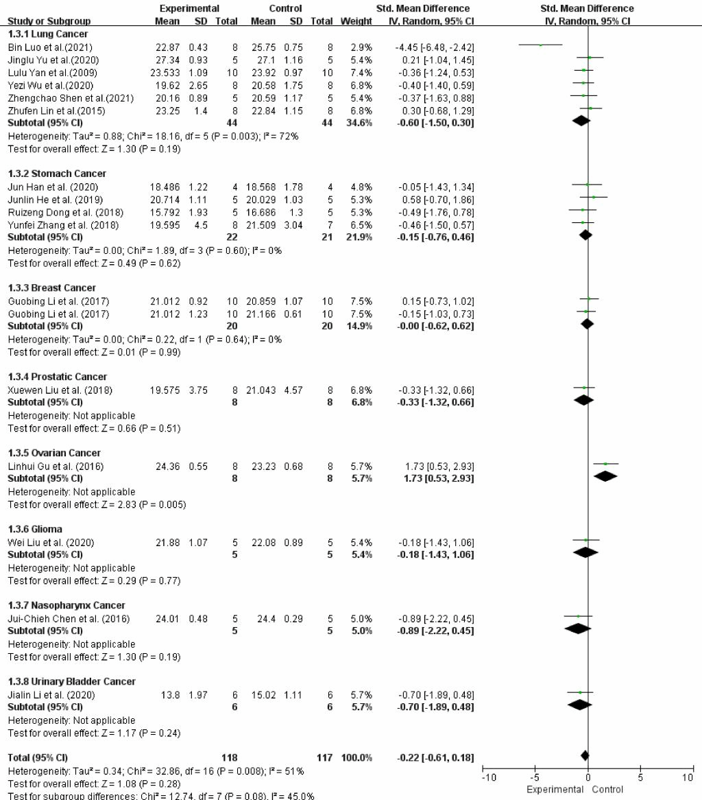 本研究得出结论(图3和图4),重楼皂苷减少了肿瘤体积(SMD:-3.35;95%CI:4.27至-2.43;p<0.00001)和肿瘤重量(SMD:-3.79;95%CI-4.75至-2.82;p<.00001),表明了其良好的癌症治疗效果。实验小鼠的体重(SMD:-0.22;95%CI:-0.61-0.18;p=0.28)差异不显著,表明了在试验范围内重楼皂苷的使用剂量不影响小鼠的生长。此外,论文中还提到了重楼皂苷抗肿瘤活性的分子机制,例如P53信号通路、NF-kB信号通路、AMPK信号通路和ERK信号通路等。