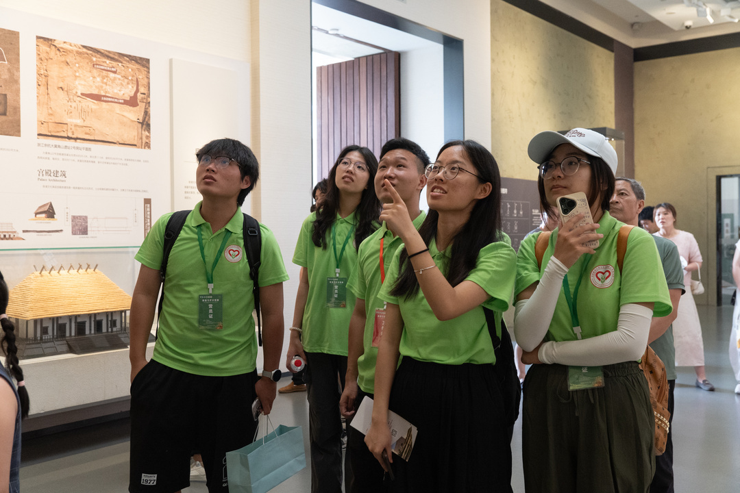 午后的良渚博物院,一粒碳化稻谷的故事更令人震撼。跟随着讲解员的讲解,营员们在巨幅稻田复原图前驻足,想象着良渚人“刀耕火种”的场景。而当脚步踏入良渚遗址公园,眼前翻滚的万亩稻浪给出了最生动的答案——风吹过沉甸甸的稻穗,沙沙声像是远古与现代的对话,诉说着人类与粮食相依相伴的漫长岁月。