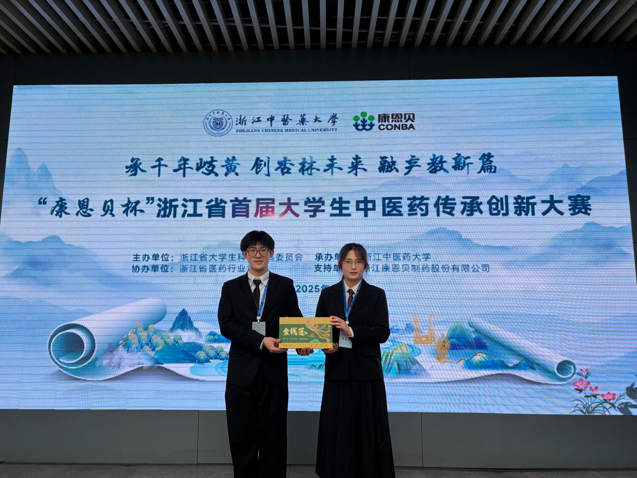 “康恩贝杯”浙江省首届大学生中医药传承创新大赛由浙江省大学生科技竞赛委员会主办,浙江中医药大学承办,浙江省医药行业协会协办。此次大赛以“承千年岐黄,创杏林未来,融产教新篇”为主题,吸引省内外33所高校122支队伍、近600名师生参赛。
