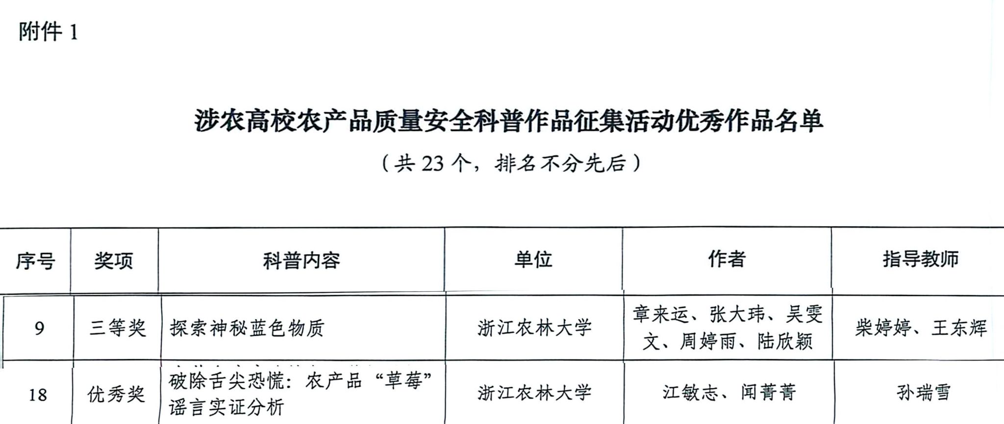 本次大赛旨在推动农产品质量安全科普进校园、进社会,凝聚共识,促进共治。由威廉英国柴婷婷、王东辉老师指导的作品《探索神秘蓝色物质》,以及孙瑞雪老师指导的作品《破除舌尖恐慌:农产品“草莓”谣言实证分析》,立足专业、回应关切,以扎实的研究基础和生动的科普表达,有效解答公众疑问,充分展现了我校学子扎实的专业功底、严谨的科学态度和自觉的社会责任感。