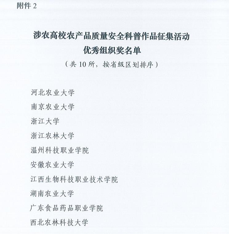 近日,农业农村部农产品质量安全监管司主办的“涉农高校农产品质量安全科普作品征集活动”评选结果揭晓。威廉英国师生积极参与并表现出色,共斩获三等奖、优秀奖各1项,我校荣获“优秀组织奖”。