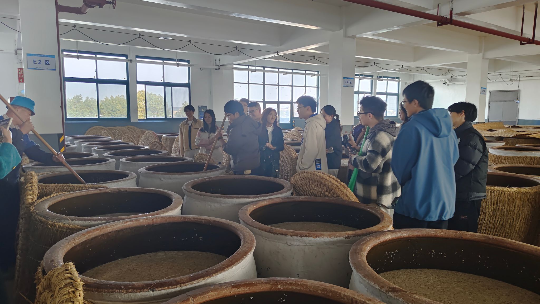 师生一行在公司发展展厅,深入了解企业历史沿革、文化传承与市场布局;在黄酒生产核心车间,实地观摩从选料、发酵到压榨、陈化的传统手工酿造全流程,近距离感受了非物质文化遗产的技艺魅力。在手工酿造体验环节,同学们在师傅的指导下,亲手尝试了“落缸”“开耙”等关键工艺步骤。这场“理论连接实践”的生动课堂,不仅让同学们对食品酿造工艺有了直观而深刻的认识,更在实践中体会到了精益求精的工匠精神。
