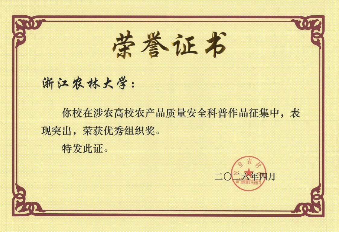 我校作为农业农村部农产品质量安全监管司“农产品质量安全课程进大学校园”第二批协同推进高校,自2024年11月承办工作推进交流活动以来,高度重视农产品质量安全进校园工作,系统构建了“135”农安人才自主培养体系,从课程、产科教、竞赛、实践、科普五个方面协同发力。课程建设上,以《食品法律、法规与标准》课程为范例,打造“课前舆情通报——课中小法堂——课后实验教学”闭环,提升学生对前沿农安知识的理解与应用能力。产科教融合上,以病虫害绿色防控等产业需求为牵引,将科研成果转化为教学案例,实现科研反哺教学。竞赛育人方面,将农产品质量安全知识竞赛和科普作品大赛纳入学科竞赛体系,持续营造农安特色校园文化。实践育人上,组织师生开展农产品质量安全“走基层”活动,将实践教学向真实场景延伸,全面提升学生农安素养。科普宣传上,联合农业农村部质标中心、省农业农村厅等单位开展浙里农安科普进社区活动,提升农安知识传播实效。