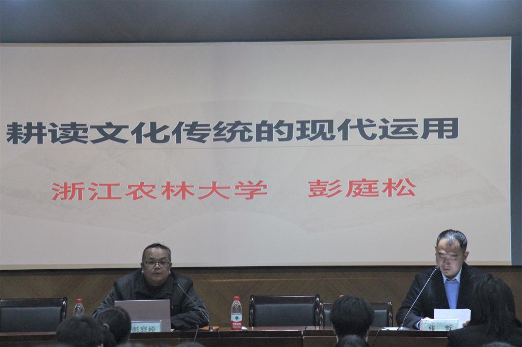 仪式后,文法学院副院长彭庭松老师开展了以“耕读文化”为主题的讲座。在讲座上,他详细阐述了古人对待耕读的态度、耕读文化的优良传统以及涉农高校的耕读教育。彭老师利用诗词引领大家仔细了解了“耕读文化”的具体内涵,并叙述了“耕读文化”在中国历史上的相关表现,为同学们上了生动而形象的一课。