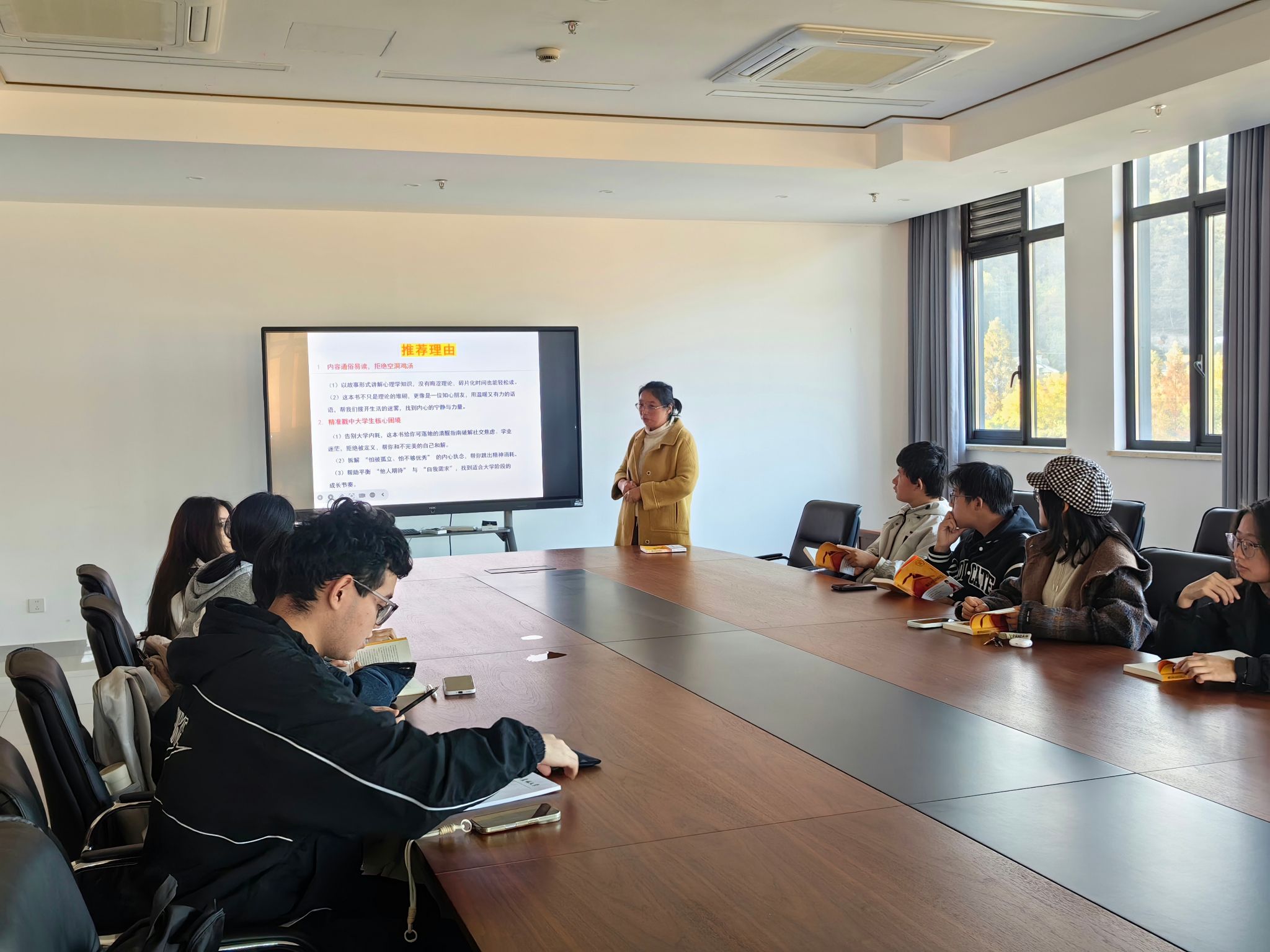 随后,许老师聚焦书中核心内容,提炼出六个极具启发性的关键理念,并为同学们逐一进行详细阐释。从“于他人的注视中辨明真我与小我”,引导大家摆脱外界评价的束缚;到“以吸引力法则确定人生目标”,启发同学们以积极的信念推动自身成长;从“接纳无法掌控之事的豁达”,教导大家与生活达成和解;到“实现身体与内心的协调一致”,强调身心和谐的重要性;从“不为不属于自己的观众演绎不擅长的人生”,鼓励大家坚守本心、拒绝内耗;再到“追寻内心的平静与安宁”,点明自我成长的最终方向。讲解过程中,许老师结合自身经历,分享了自己年轻时一味迎合他人期待、在世俗标准下疲于奔命,最终却无法满足自己期望的过往。她的真诚分享让同学们深受感动,也使抽象的道理变得具体可感。