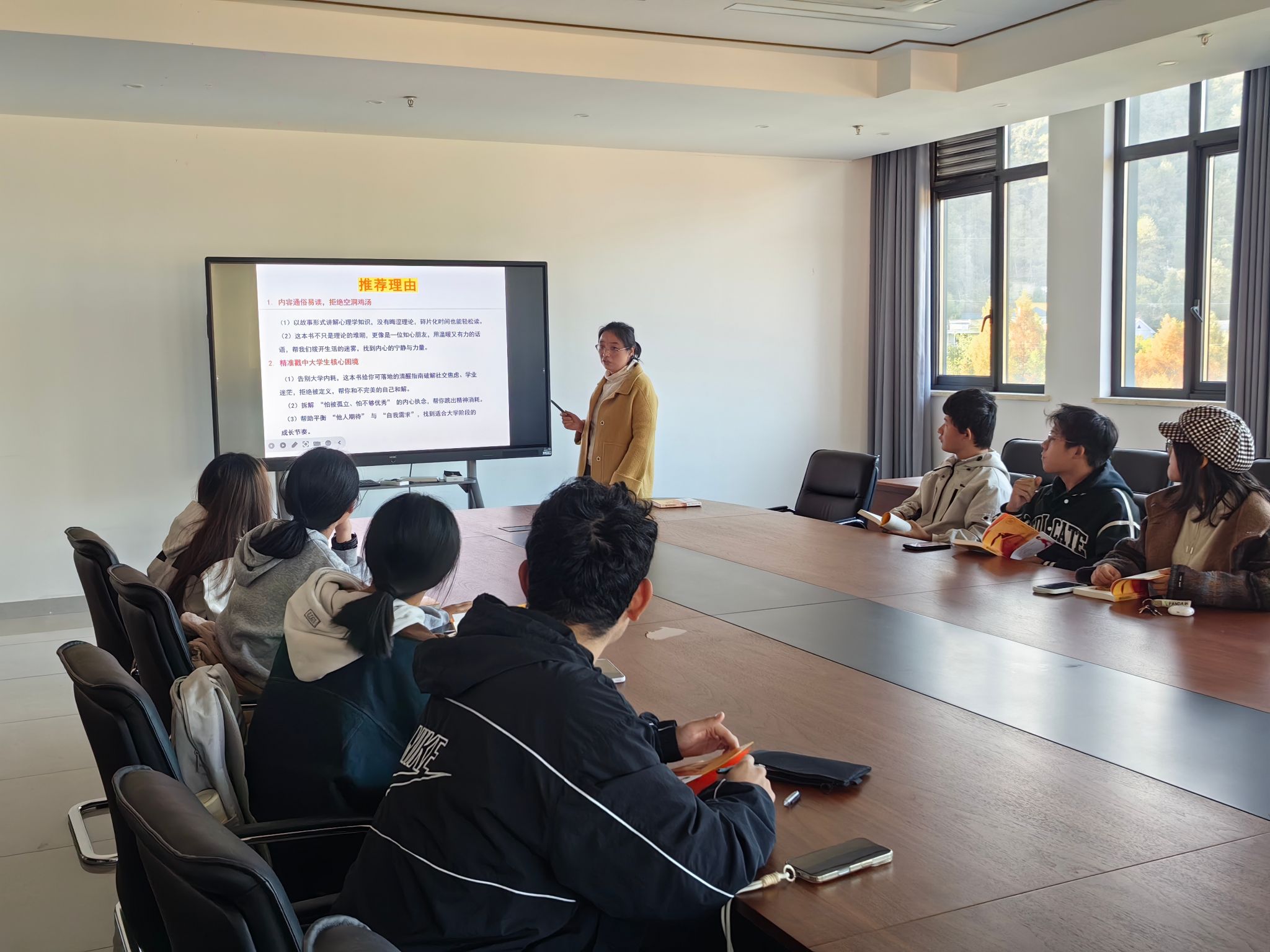 读书会临近结束时,许老师引用书中那句震撼人心的话语送给在场的每一位同学:“亲爱的,外面没有别人,只有你自己。”她勉励同学们,人生并非与他人的竞争,不必在比较中迷失自我。唯有将自己置于心灵的核心位置,倾听内心的声音,接纳自身的所有状态,才能在纷繁复杂的世界中找准定位,寻得真正的自我。